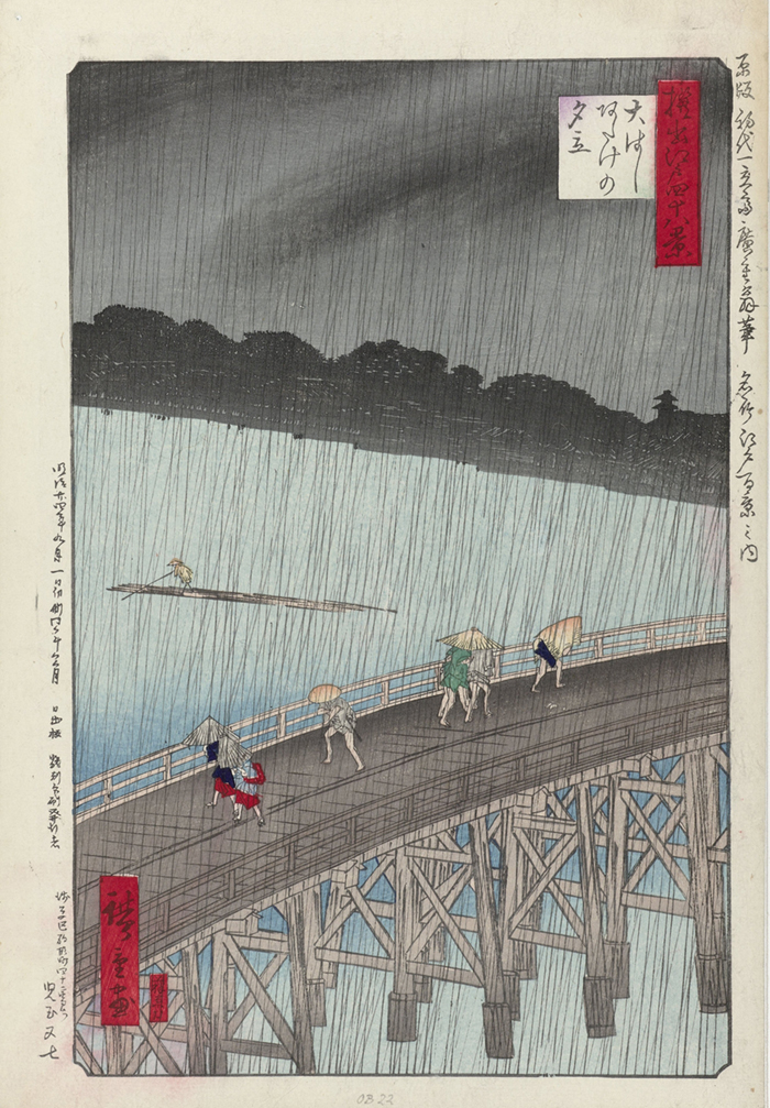 名所江戸百景の第52景である本作は、隅田川にかかる大はしを夕立の中渡る人々をモチーフに採用します。