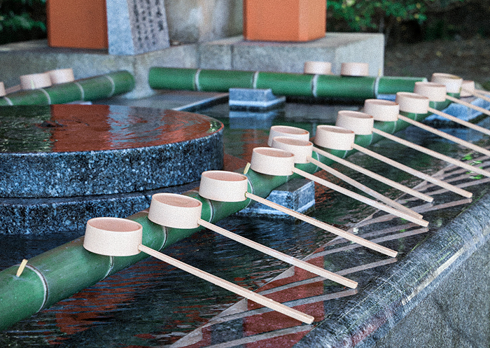 身を清めるために、柄杓(ひしゃく)を使って手と口をすすぎます。