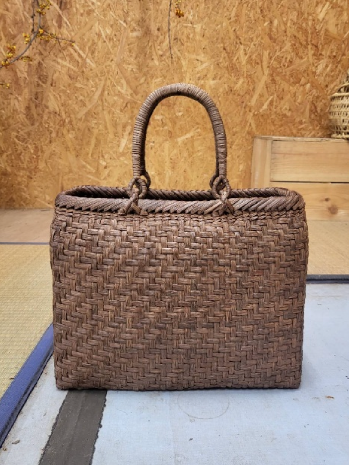 節や、肌のグラデーションや汚い部分もあり、あじろ編みに適した部分はあまりありません。そんな自然の皮にバカにされないようにしっかり組まれたあじろ編みは、堅牢さの中にも自然の温もりを感じられます。使い込みほどに飴色に艶があがり、愛着が増し離しがたい籠となります。持ち手部分は、芯はあけび蔓で回りを山葡萄で巻いています。